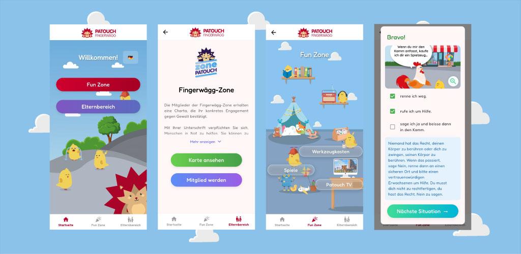 Dank dieser App hat jede und jeder direkten Zugriff auf sämtliche von Fingerwägg entwickelten Inhalte: die Toolbox, spielerische Videos für Kinder zu zentralen Themen (Emotionen, Grenzen, Sicherheit, Selbstvertrauen …), die Fingerwägg-Zonen (Konzept verstehen, eine Zone in der Nähe finden, sich engagieren) sowie einen schnellen Zugang zu Hilfs- und Notrufnummern (Fingerwägg-Hotline, Polizei).